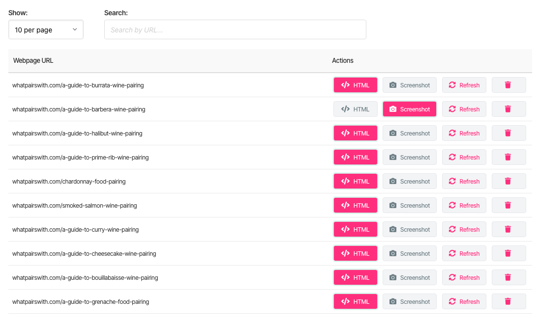 Page content changes regularly. Click Refresh on any URL to recapture both HTML and screenshots.