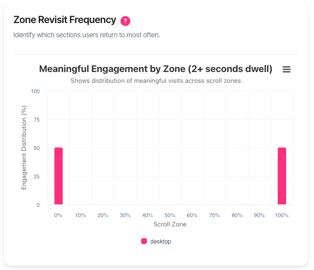 Compare this chart with Scroll Depth vs Time Spent. If visitors reach a section (shown in time spent data) but don't engage meaningfully (shown here), the content exists in a "scroll-through zone"—seen but not read.
