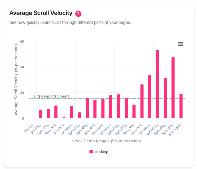 This chart reveals how quickly visitors scroll through each section of your page. Fast scrolling means skimming. Slow scrolling means reading.