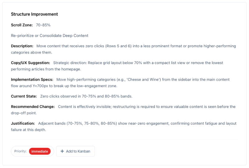 The primary output—specific, actionable changes organised by scroll zone. Each recommendation includes: