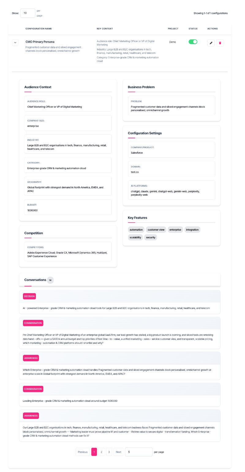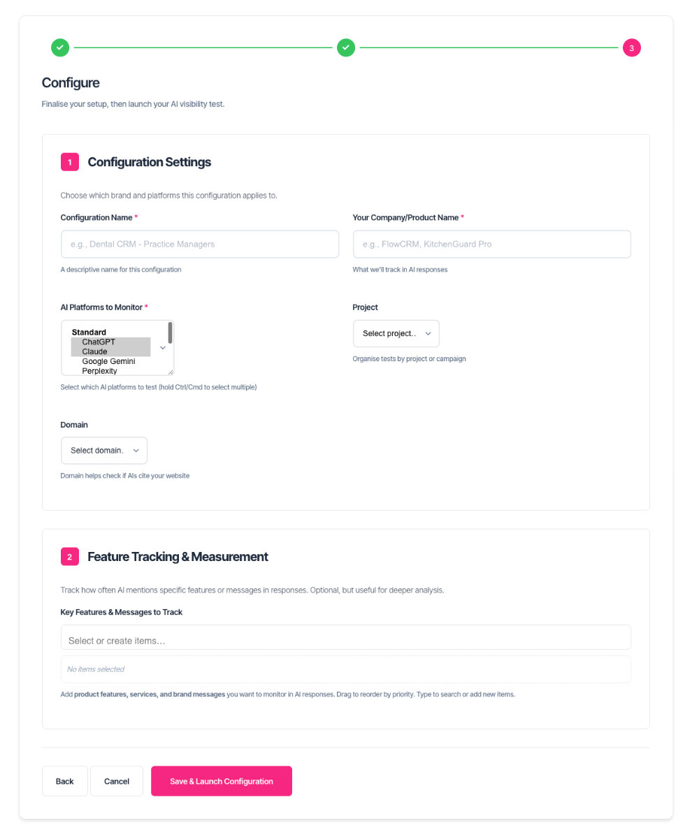 Your configurations are the foundation of AI visibility tracking. Keep them updated as your market position evolves, and you'll get insights that matter.