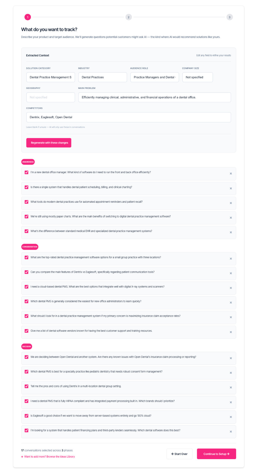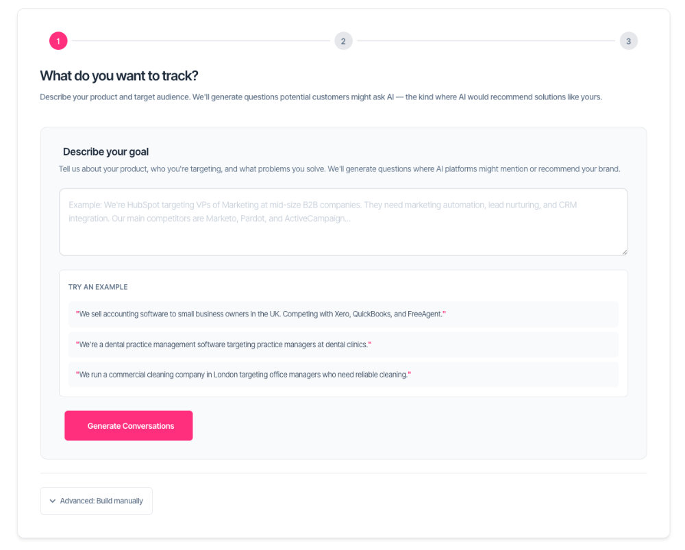 Click the pink Generate Conversations button. A loading spinner appears while the system analyses your description and creates 15-18 realistic questions your potential customers might ask AI.