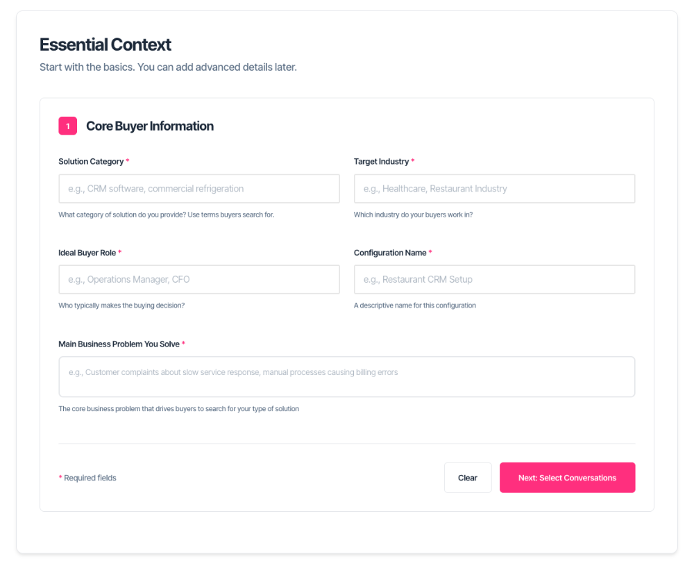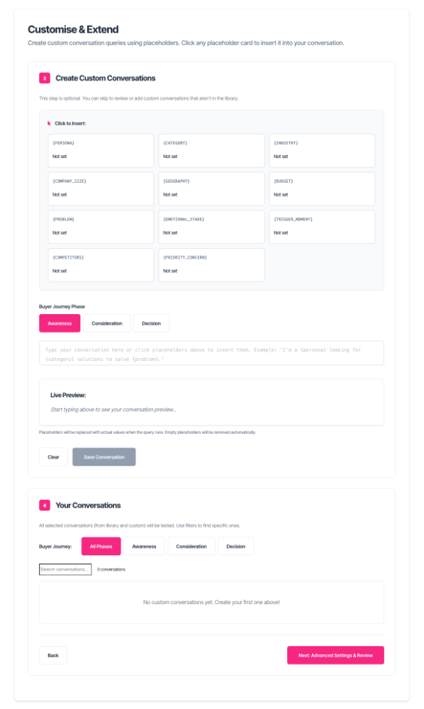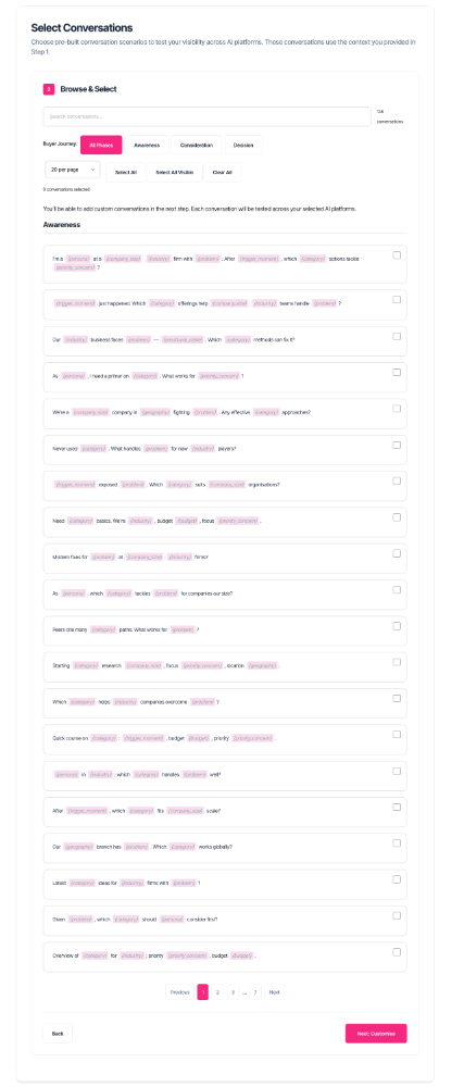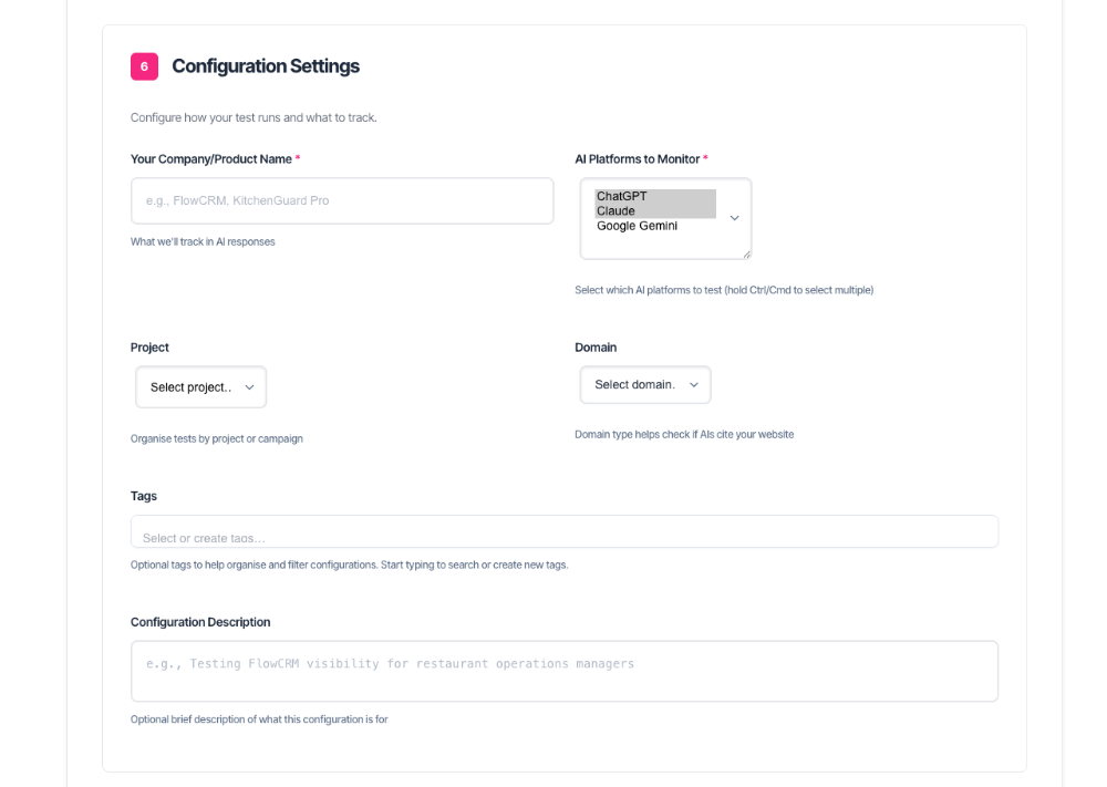 AI Visibility Tracking tests realistic buyer scenarios to see when and how your brand appears in AI responses. Each configuration defines: