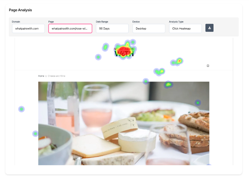 A colour overlay appears on your page. Warmer colours (towards red/orange) indicate areas with more clicks. Cooler colours (towards blue/purple) show fewer clicks. Areas without colour received no clicks during the selected period.