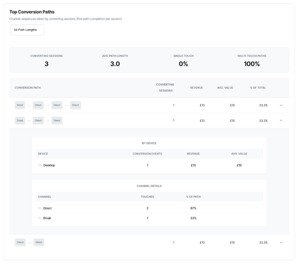 The Top Conversion Paths feature reveals the actual channel sequences your customers follow before converting. Instead of crediting a single channel, this analysis shows you the complete journey – every marketing touchpoint along the way. This guide will help you understand these paths and use them to optimise your marketing mix.