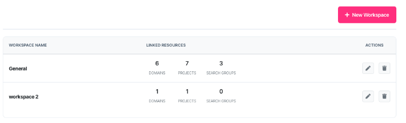 Workspaces keep domains, projects and search groups organised. Create separate workspaces for different clients, regions or business units.