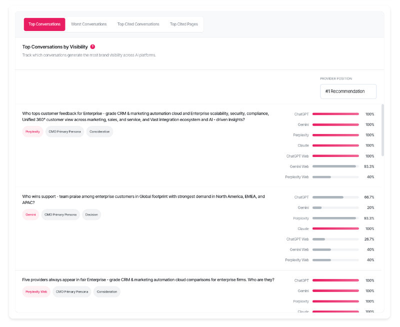 The default "#1 Recommendation" shows conversations where your brand won outright—the most valuable visibility.