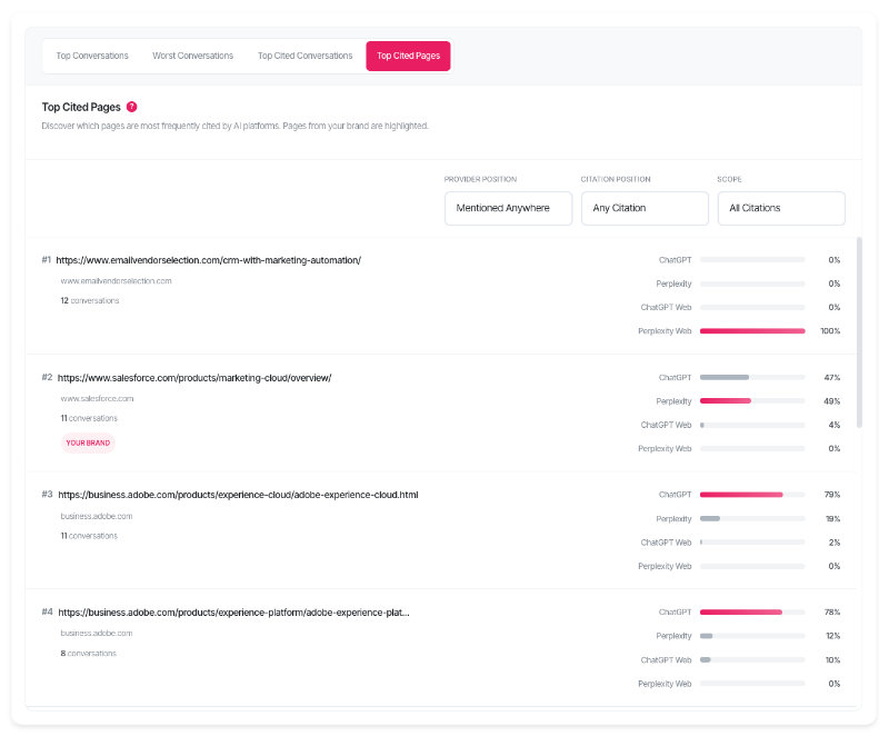 Top Cited Conversations shows which questions generate citations. Top Cited Pages shows which URLs get cited—the actual content sources AI platforms reference.