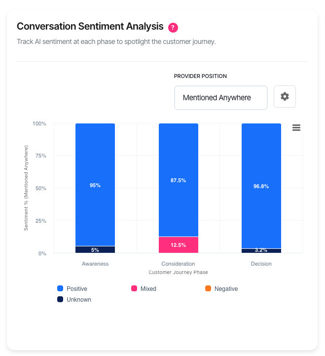 Conversation Sentiment Analysis reveals how AI platforms describe your brand at each stage of the customer journey. It tracks whether AI responses frame your brand positively, negatively, or with mixed sentiment—helping identify where brand perception needs attention.
