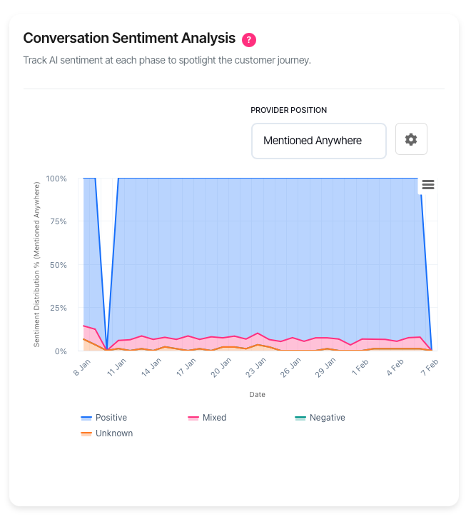 Sentiment analysis categorises how AI platforms describe your brand when they mention it. Each response where your brand appears is classified as positive, mixed, negative, or unknown based on the language used.