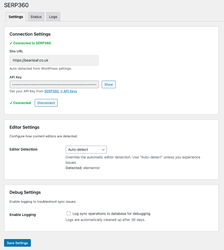 SERP360 Link Sync connects WordPress to the SERP360 platform. Once connected, the plugin automatically adds internal links to content based on recommendations from SERP360's AI. No manual editing required.