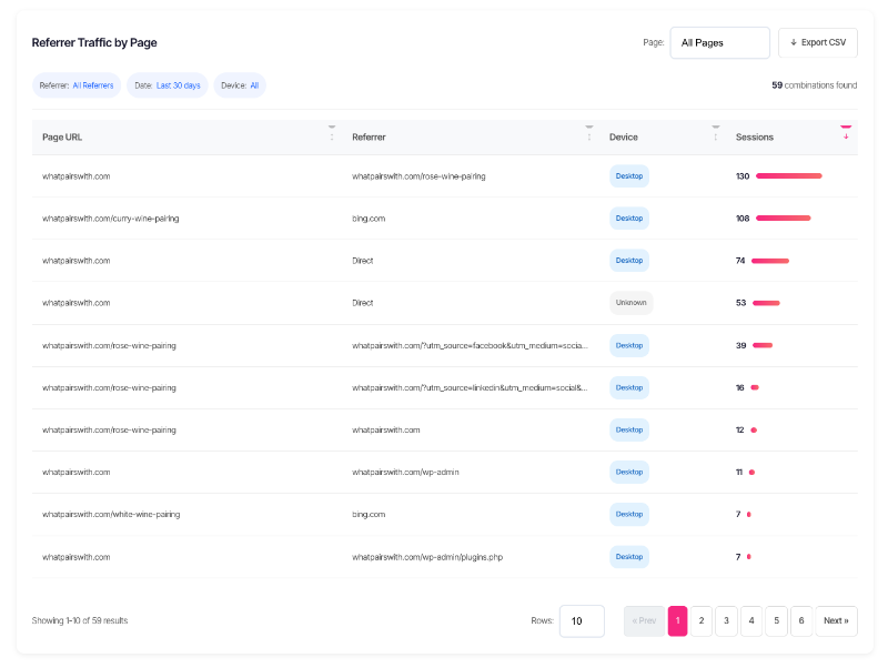 Page selector – Filter to a specific page or view "All Pages" to see every page/referrer combination.