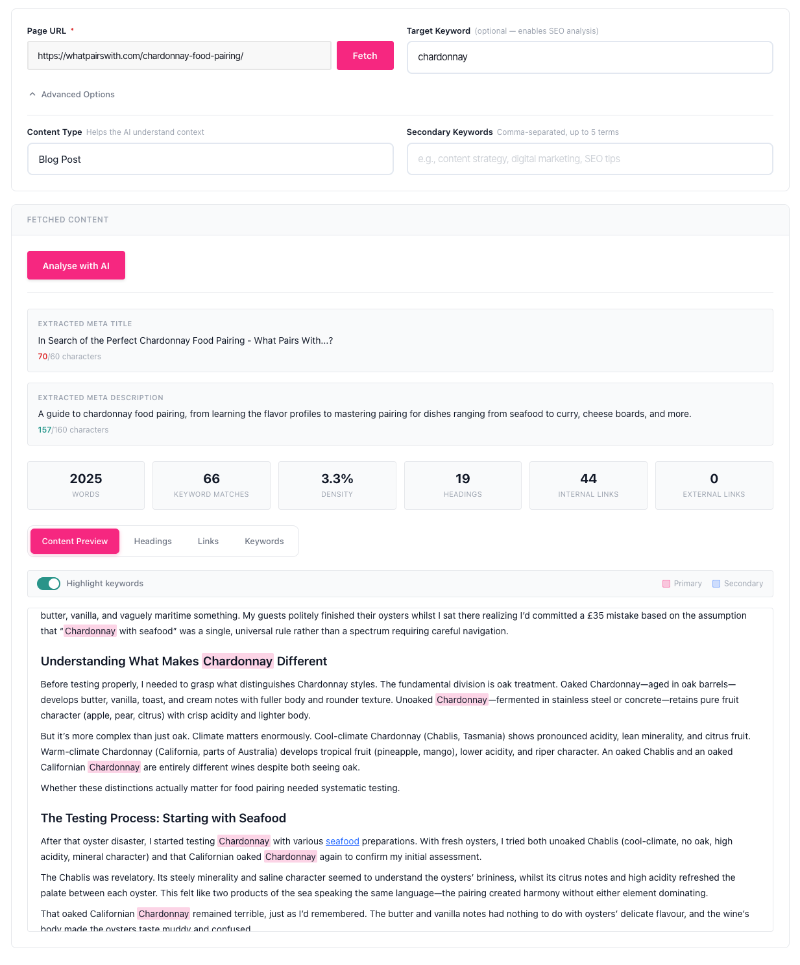Page Audit analyses any webpage for content quality and SEO performance in a single workflow. Fetch your page once, and the tool examines your content structure, keyword usage, link profile, and heading hierarchy. The built-in AI then generates specific, copy-paste ready recommendations across both content quality and search optimisation — all from one place.