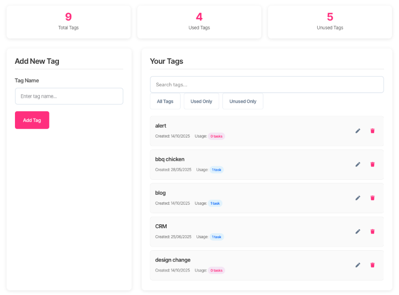 Create, organise, and manage tags for categorising tasks across projects and workspaces.