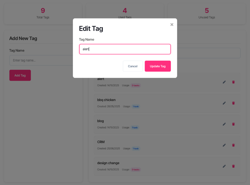 When a tag is assigned to tasks, deletion requires confirmation. The system displays how many tasks use the tag. Confirming deletion removes the tag from all associated tasks.